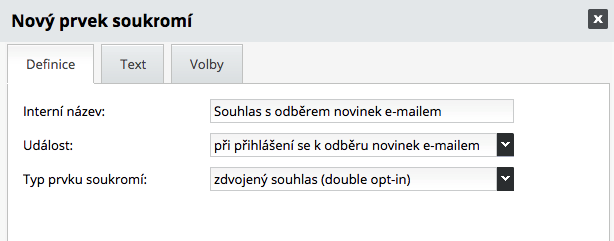 2. Vyplňte název prvku soukromí, v políčku Událost vyberte možnost při přihlášení se k odběru novinek e-mailem a v políčku Typ prvku soukromí vyberte možnost double opt-in. U double opt-in musí zákazník potvrdit platnost e-mailové adresy.