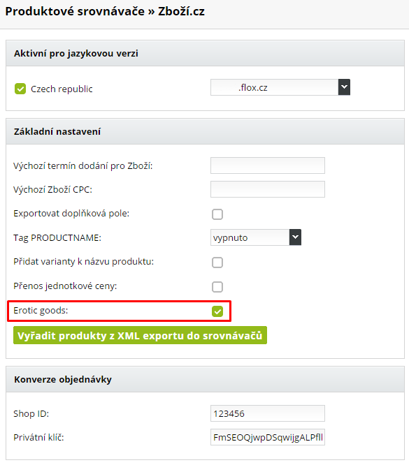 V případě, že provozujete internetový obchod s erotickým zbožím a chcete vaše produkty nabízet přes srovnávač cen Zboží.cz, musíte v administraci změnit nastavení feedu. V sekci NASTAVENÍ / PRODUKTOVÉ SROVNÁVAČE vyberte položku Zboží.cz. Následně zaškrtněte políčko EROTIC GOODS a uložte.
