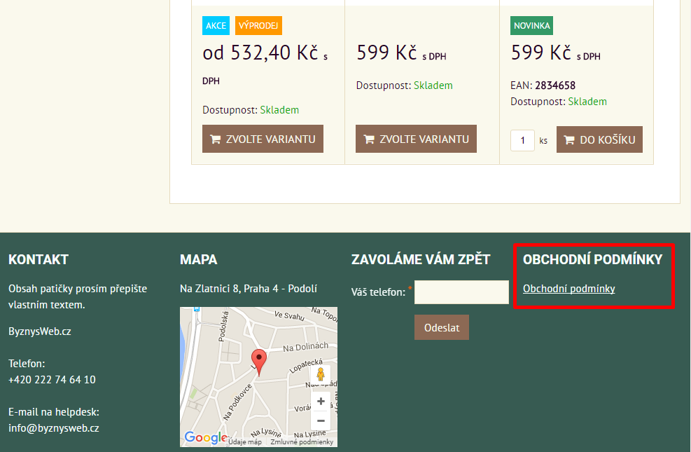 Nyní je třeba vložit odkaz na obchodní podmínky do zápatí stránky.