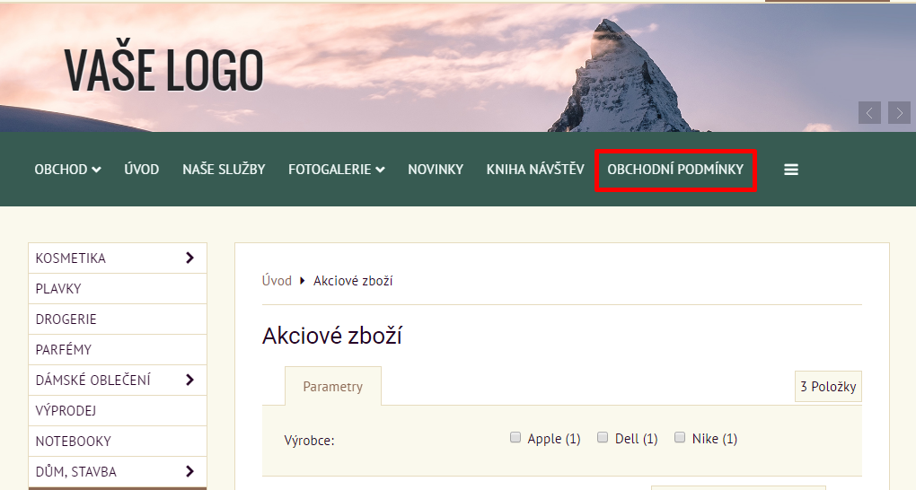Příklad 1: Obchodní podmínky chceme vložit mezi tlačítka hlavního menu.