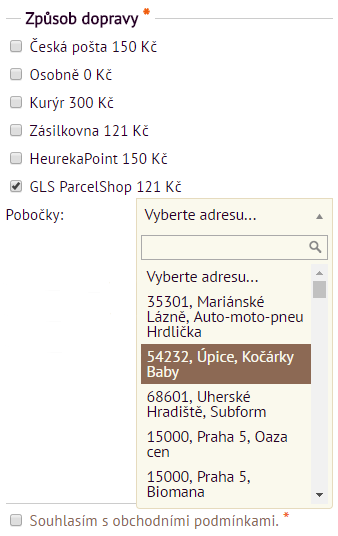V objednávkovém formuláři eshopu přibude položka GLS ParcelShop. Poté co klient zaklikne tuto možnost, objeví se seznam odběrných míst. Vyhledá a vybere si místo, které mu nejvíce vyhovuje.