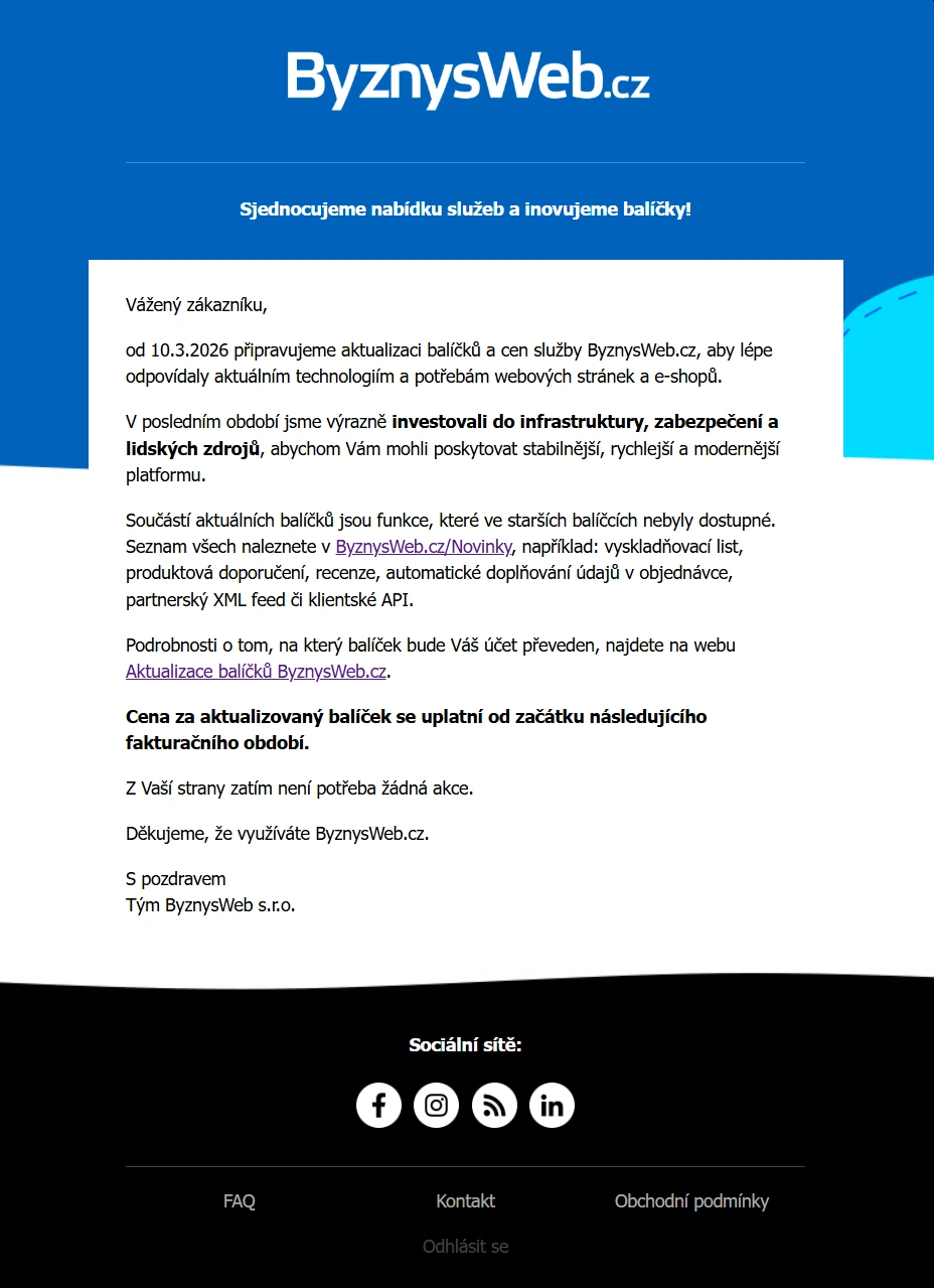 Předplatné balíčku je měsíční nebo roční. Před koncem období vám automaticky pošleme další výzvu k úhradě. Doporučujeme ale nastavit v bance trvalý příkaz. Ceny jsou bez DPH 21 %. Nemáme žádné zřizovací ani skryté poplatky – cena eshopu je konečná. Služba je bez závazků a můžete ji kdykoliv ukončit.