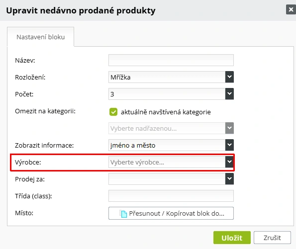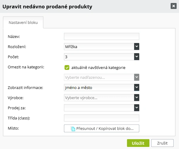 - Nový blok Nedávno prodané produkty - zobrazuje naposledy zakoupené produkty ve formátu podobném bloku Navštívené produkty. Součástí je speciální věta typu „Zakoupeno [jméno], [město], před X minutami / hodinami / dny" s nastavitelnou mírou zobrazení informací (jméno a město lze vypnout). K dispozici je rozvržení Jednoduchá mřížka a filtrování dle kategorie. V rámci tohoto i dalších produktových bloků (Nejprodávanější, Nové produkty) přibyl také nový filtr podle Výrobce.