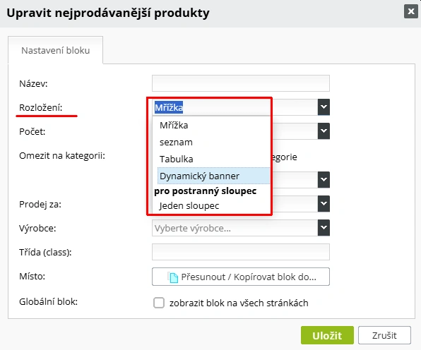 - Podpora rozvržení Dynamický banner v produktových blocích (Barcelona, Paris, Verona): rozvržení Dynamický banner je nově dostupné přímo přes nastavení bloků.